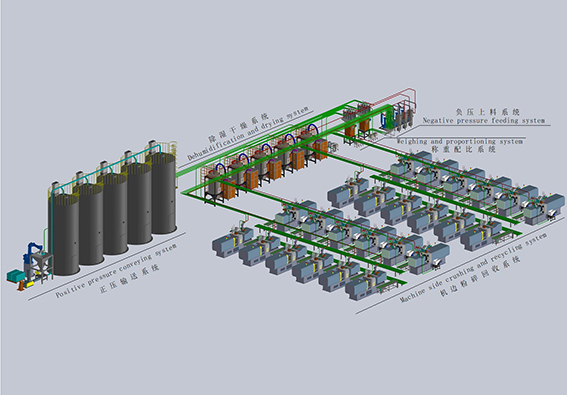 二、节能:集中输送系统操作简易,只需要少数的几个人即可以控制整个注塑工厂的供料需求,从而减少了大量的劳动力成本。其次、减少了在注塑机旁边的原料带及相应的辅助设备、提高了空间的利用率。此外、由于采用了集中供料的方式、相对应地减少了很多的单机设备,也就节省了电能及减少维护费用。
