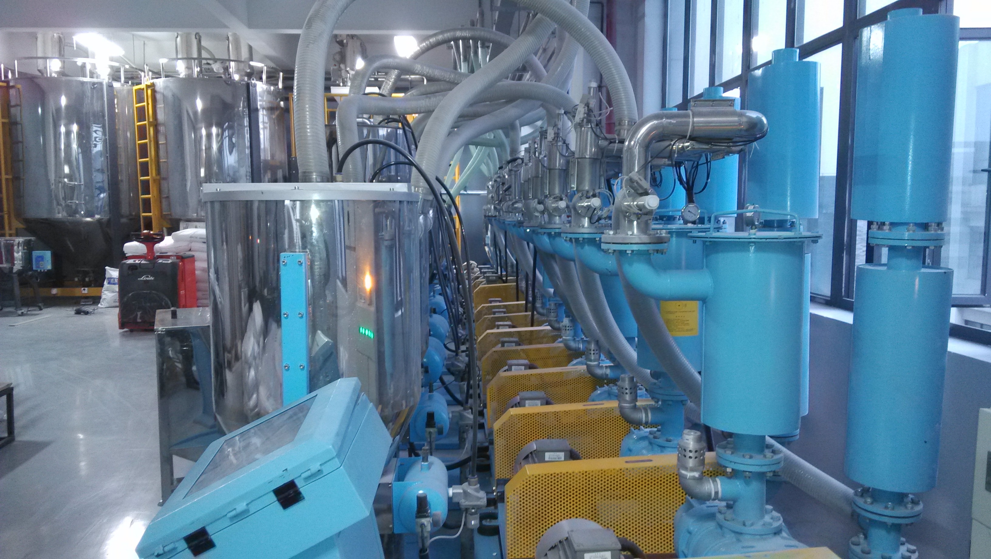 中央集中供料系统采用微机集中自动控制,实现了对粒料的24小时连续供料作业。多台小型微机分别控制各台成型机的着色工艺,计量准确、混合均匀,并可灵活改变颜色,适应对产品的多颜色多品种要求。根据不同成型机的生产量,灵活变更供料量。多个供料管道设计,可保证对主料多样化的要求。系统具有多种监控及保护功能,工作安全可靠。中央供料系统的别名有:集中供料系统、自动送料系统等。中央供料系统的优势